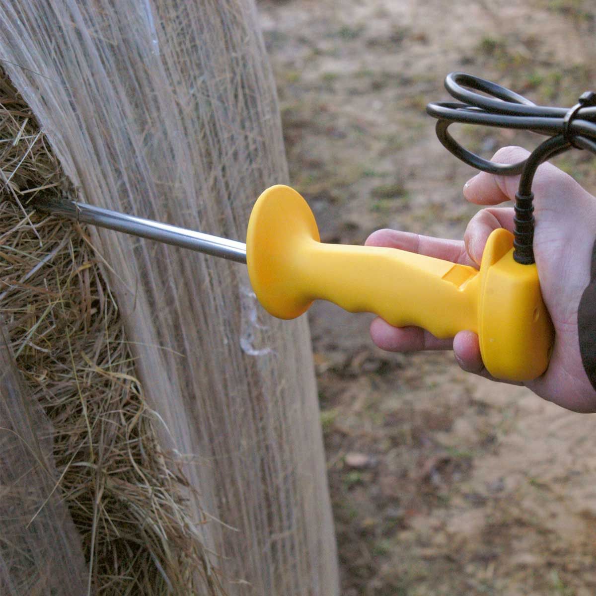 - comprenant un capteur de 55 cm de long qui enregistre les variations de la conductivité électrique du foin et de la paille et les convertit en pourcentages d'humidité