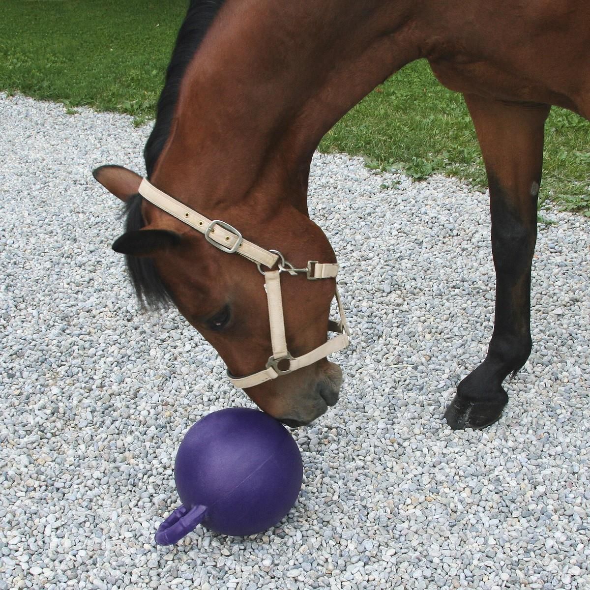 Cette balle de jeu pour chevaux se remplit d'air encore et encore grâce à la valve spéciale.