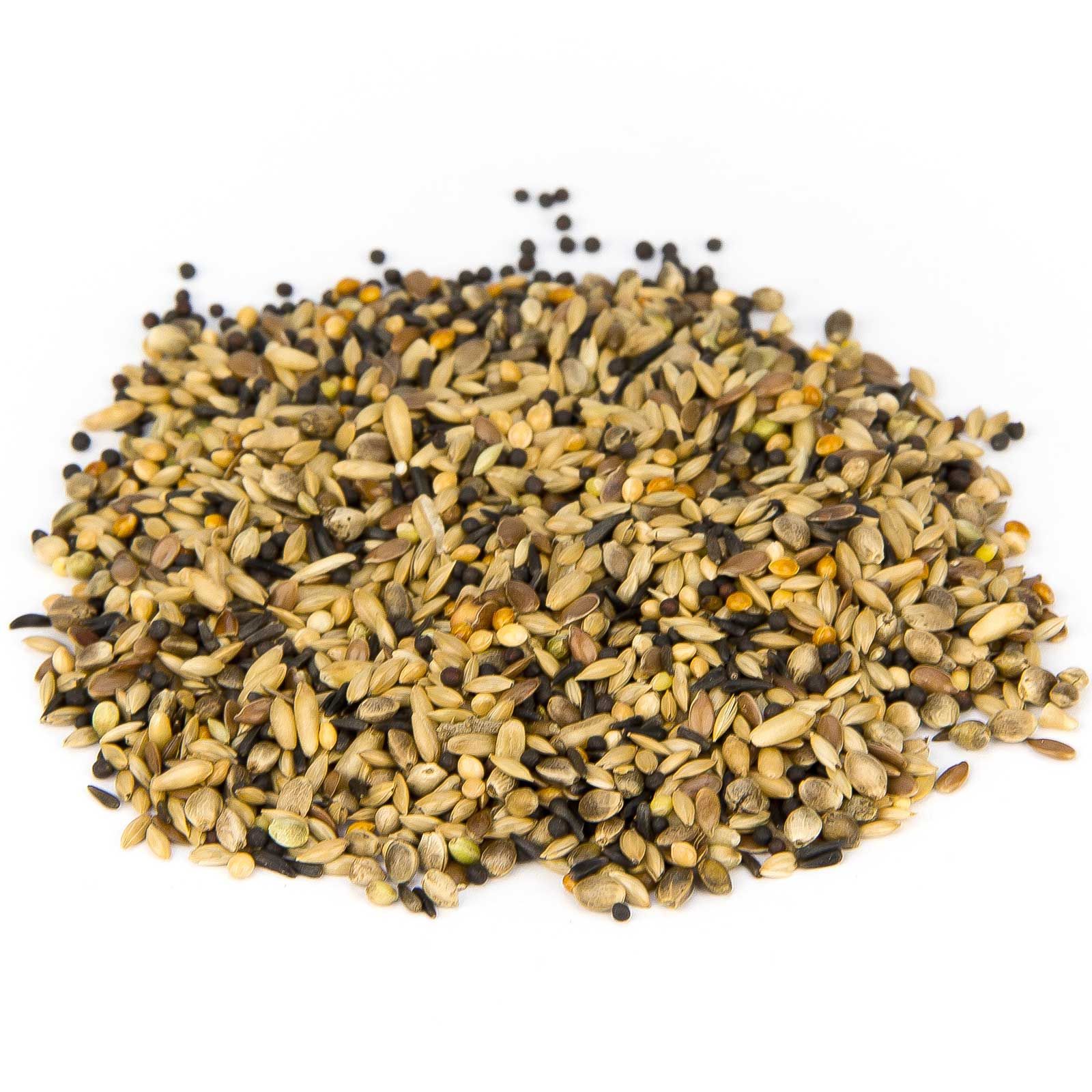 36,00 % de graines brillantes, 11,00 % de chanvre européen, 10,00 % de flocons d'avoine, 10,00 % de navet noir, 10,00 % de millet jaune, 10,00 % de graines de lin, 9,00 % de graines de nègre, 4,00 % de millet rouge