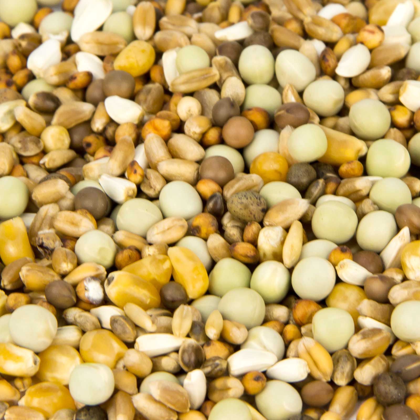 18% petits pois, 10% vesces, 18% petit maïs, 24% blé, 14% blé millet, 4,5% dari, 7% graines de cardon, 2% chanvre, 2,5% flocons d'avoine.