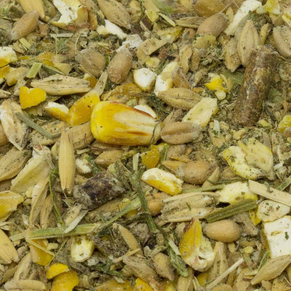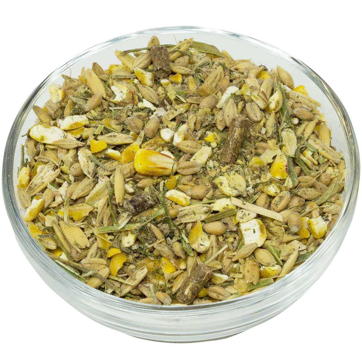 Maïs grossier, orge, blé, avoine concassée, tourteau d'extraction de soja (fèves) avec pâte à savon (chauffé à la vapeur), foin de luzerne coupé, pellets de farine verte de luzerne, son de blé fin, mélasse de betteraves, tourteau d'extraction de lin, copeaux d'herbe séchée à l'air chaud, huile de tournesol, lignocellulose, carbonate de calcium, germes de maïs