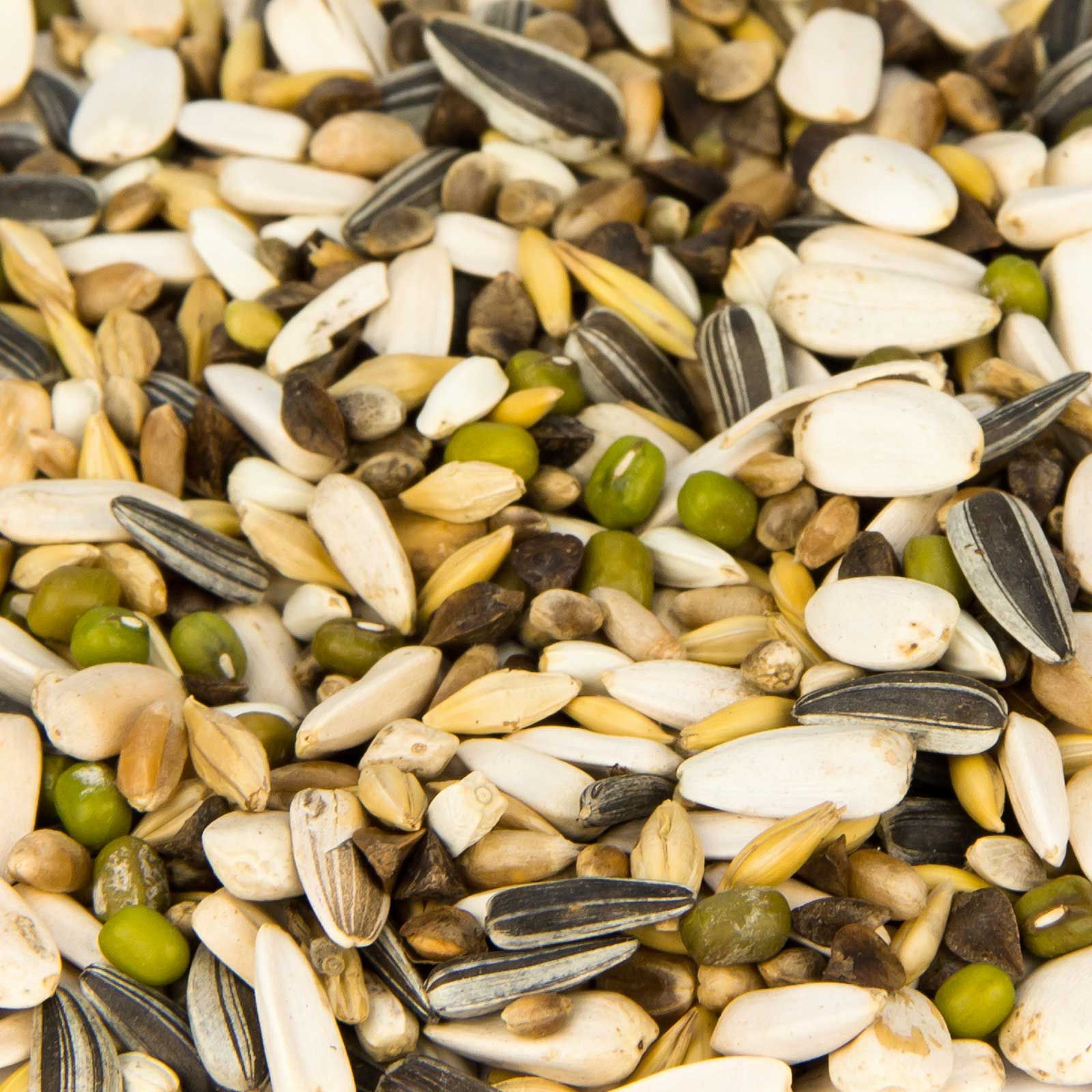 10 % haricot mungo, 10 % graines de cardes, 15 % tournesol blanc, 15 % tournesol rayé, 10 % chanvre, 10 % sarrasin, 10 % orge de brasserie, 10 % blé, 10 % avoine.