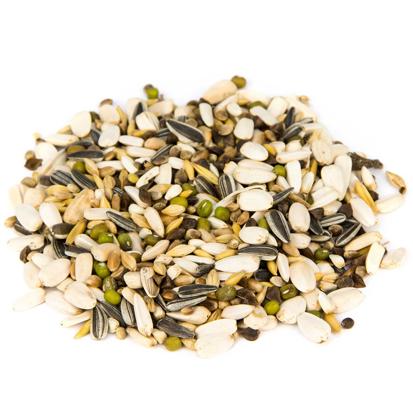 10 % haricot mungo, 10 % graines de cardes, 15 % tournesol blanc, 15 % tournesol rayé, 10 % chanvre, 10 % sarrasin, 10 % orge de brasserie, 10 % blé, 10 % avoine.
