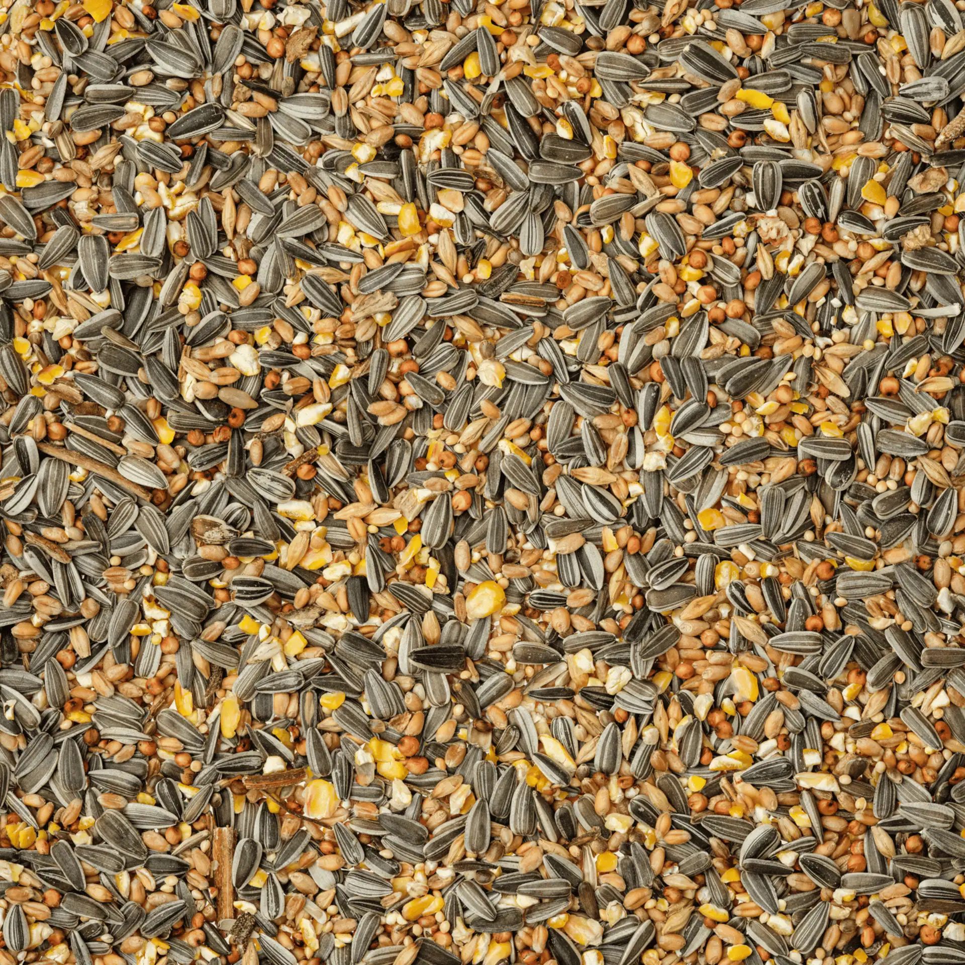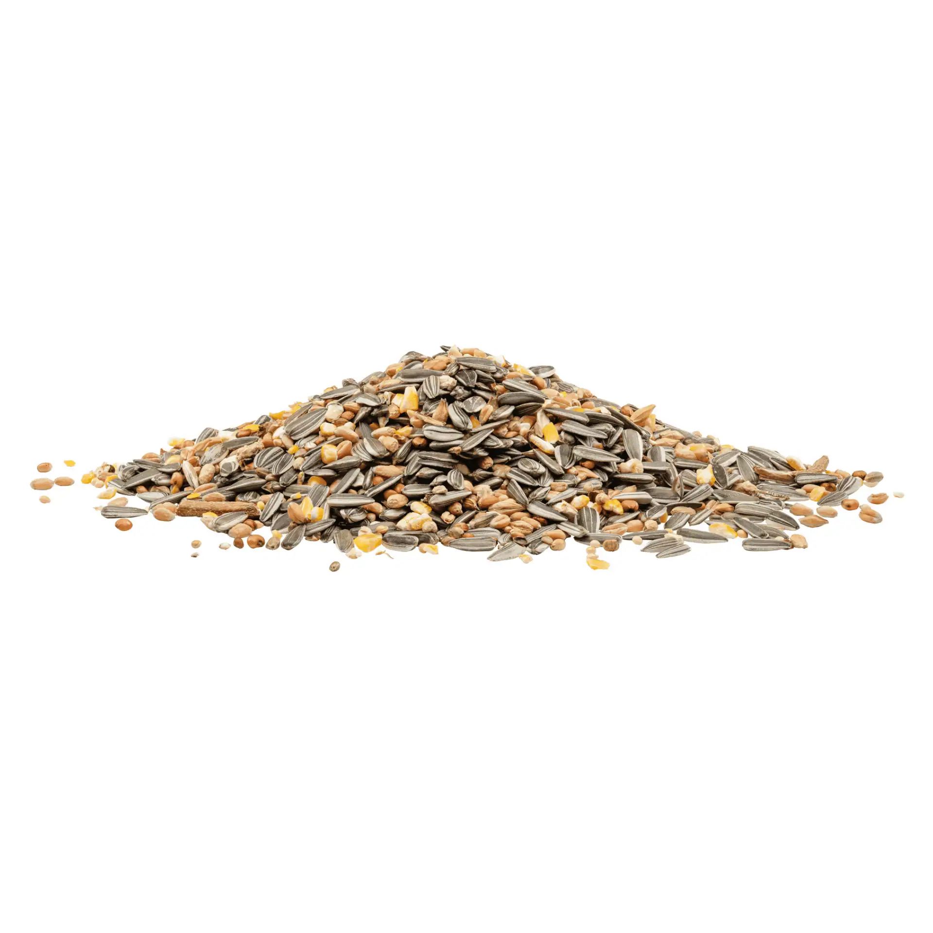 Composition: 35,00 % graines de tournesol striées, 25,00 % blé, 17,00 % maïs concassé grossier, 10,00 % grains de mil, 5,00 % millet jaune, 5,00 % orge de brasserie, 3,00 % chanvre européen.