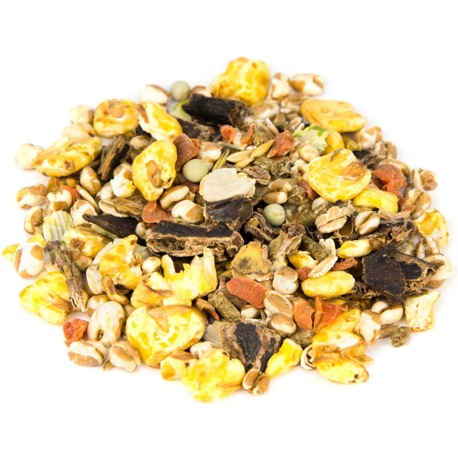 Caroube coupée, maïs éclaté, petits pois verts, petit maïs, blé éclaté, avoine, cubes de carottes, flocons de pois, flocons de blé, flocons d'avoine, son de blé grossier, farine verte, blé, concentré de maïs, marc de pomme, anis, pulpe séchée, racine de guimauve, Racine de réglisse, tyme, feuilles de tussilage, herbe d'achillée, feuilles de mûres, farine d'extraction de colza avec bâtonnet, gâteau de graines de courge, hibus coupé, mélasse, lignocellulose, carbonate de calcium, phosphate monocalcique, chlorure de sodium, bicarbonate de sodium, oxyde de magnésium