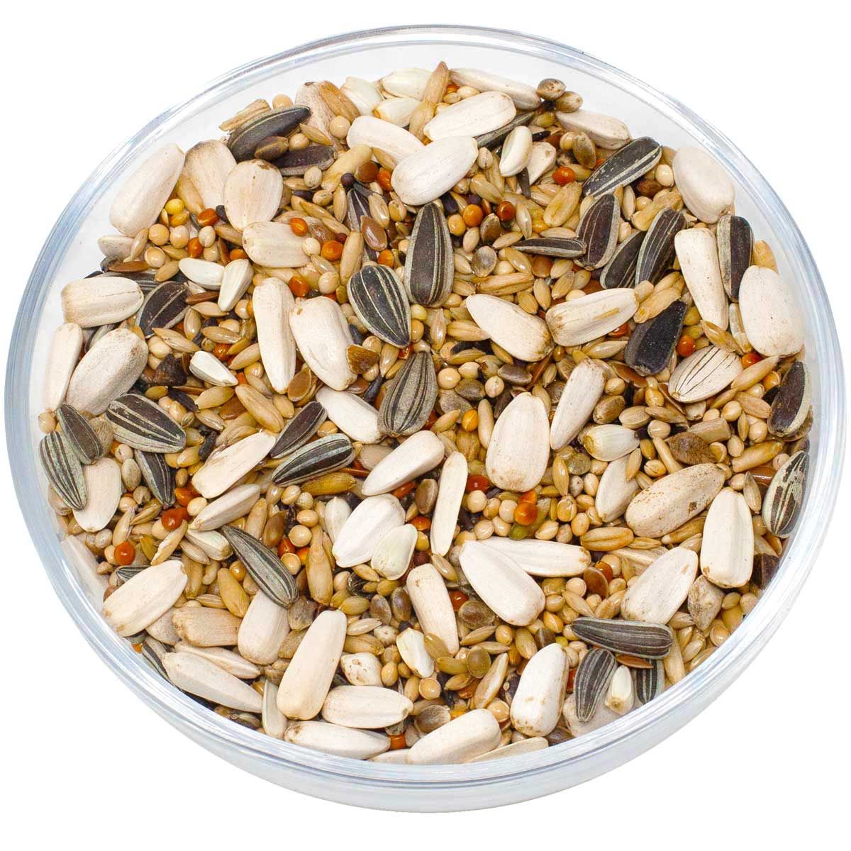 21,00 % de graines brillantes, 20,00 % de millet jaune, 9,00 % de flocons d'avoine, 9,00 % de millet rouge, 9,00 % de graines de tournesol blanc, 9,00 % de graines de tournesol rayées, 6,00 % de graines de lin, 6,00 % de graines de nègre, 4,00 % de chanvre européen, 3,00 % de colza noir, 2,00 % de graines de carthagène, 2,00 % de sarrasin