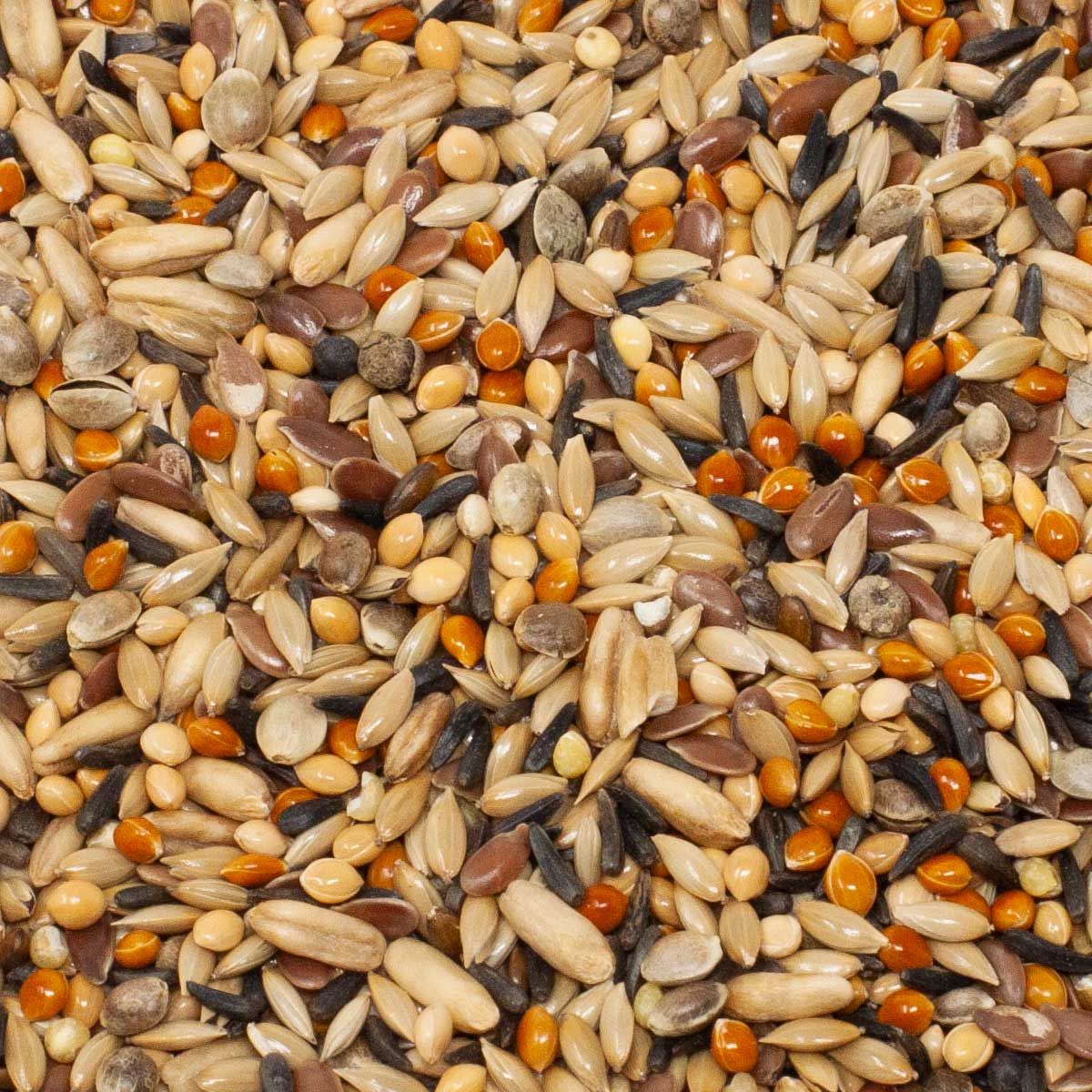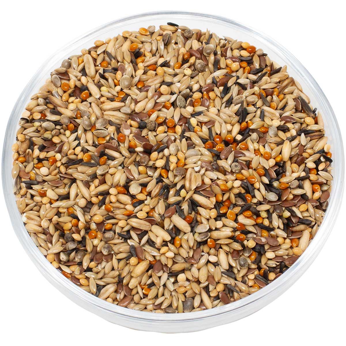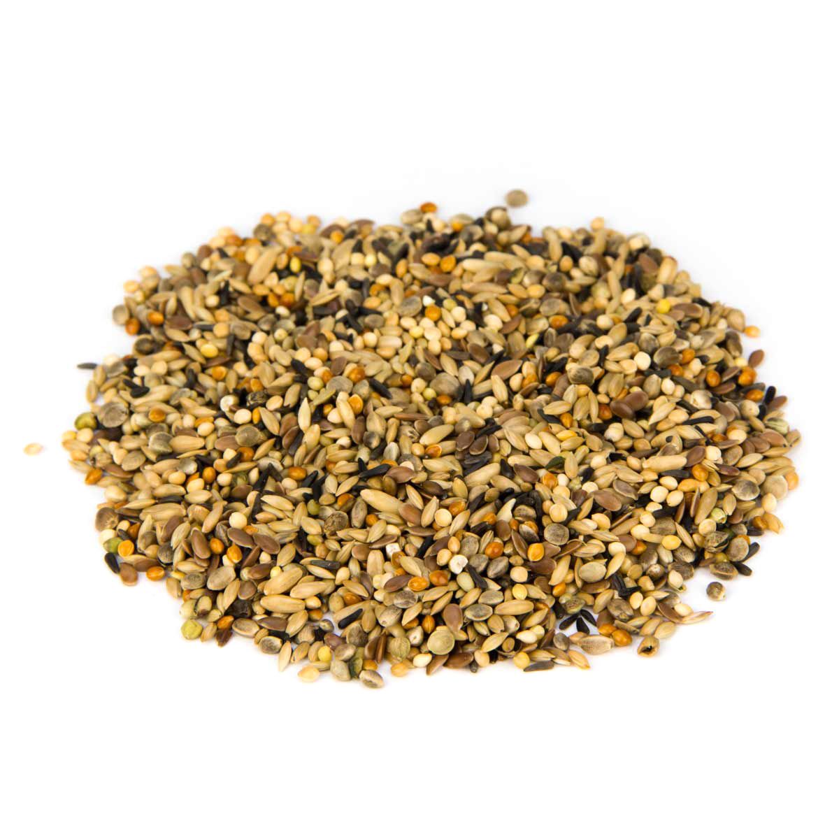 36,00 % de graines brillantes, 13,00 % de millet jaune, 13,00 % de chanvre européen, 10,00 % de flocons d'avoine, 10,00 % de graines de lin, 9,00 % de graines noires, 9,00 % de millet rouge