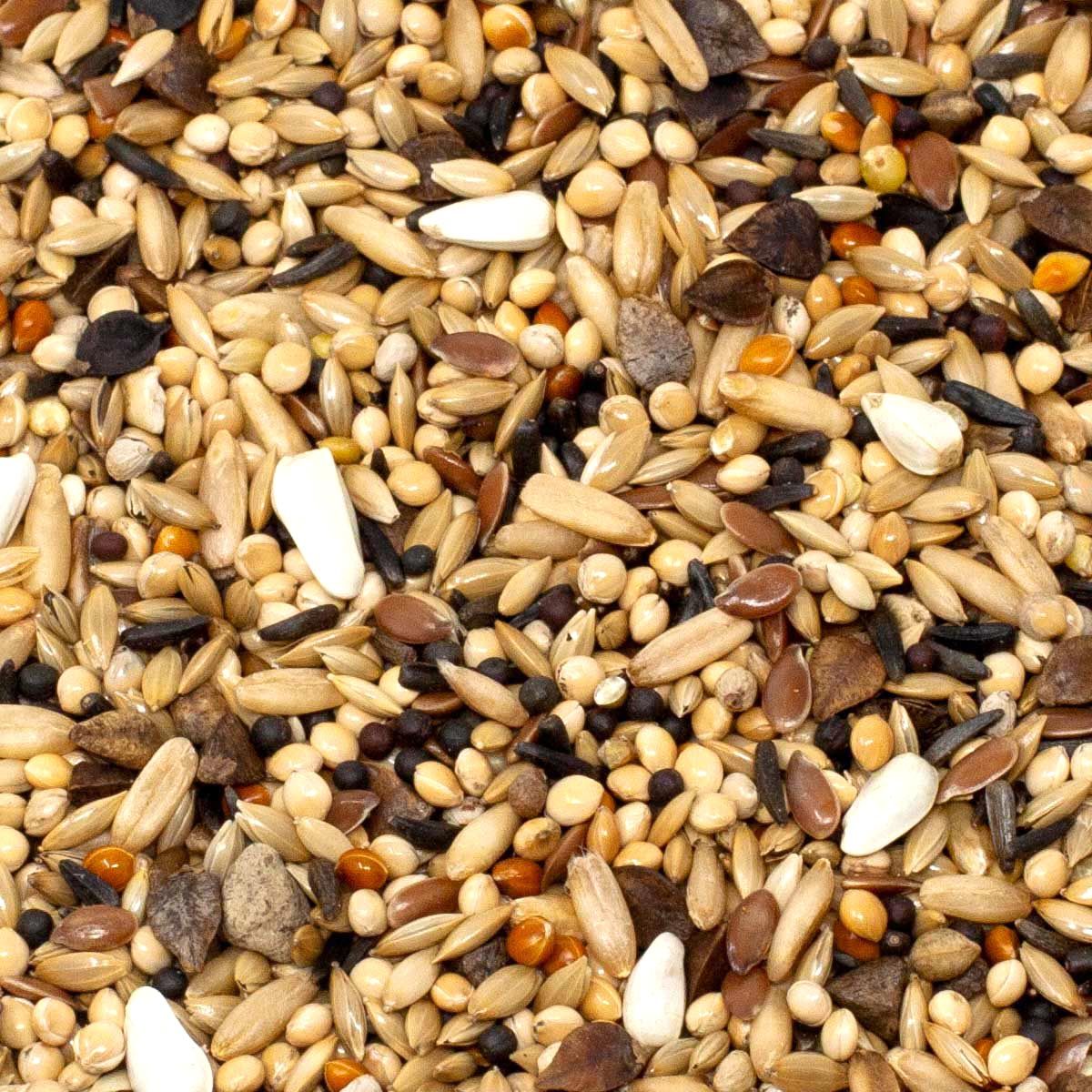 36,00 % de graines brillantes, 25,00 % de millet jaune, 8,00 % de flocons d'avoine, 7,00 % de graines noires, 7,00 % de graines de lin, 5,00 % de sarrasin, 4,00 % de colza noir, 4,00 % de millet rouge, 2,00 % de graines de Cardiacées, 1,00 % de chanvre européen, 1,00 % de graines de pérille blanc