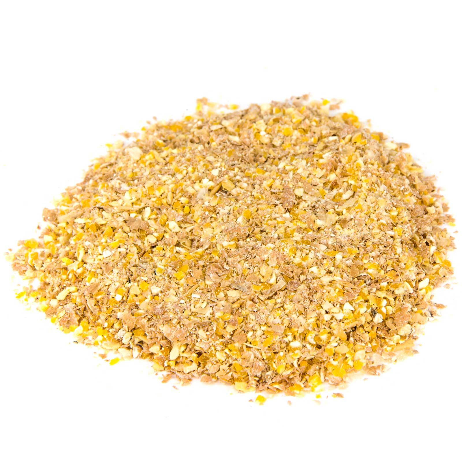 Semoule de maïs, farine d'extraction de soja (haricots) avec pâte à savon (chauffée à la vapeur), son de blé grossier, carbonate de calcium, phosphate monocalcique, huile de tournesol, chlorure de sodium